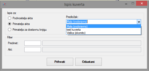 Filtrirati se može po predmetu ili po aktu. Može se ispisati mala koverta (vodoravno postavljena) ili velika (okomito).
