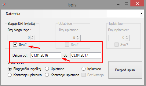 Dorađen je blagajnički izvještaj. Omogućeno je da se ispišu svi blagajnički izvještaji odjednom. Klikne se na kućicu Sve i program ispiše sva blagajnička izvješća. Automatski zada datum od 01.01. kao početni kriterij i trenutni datum kao krajnji kriterij.