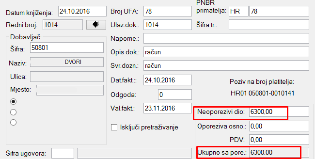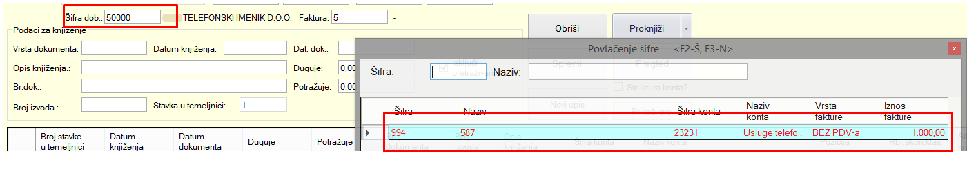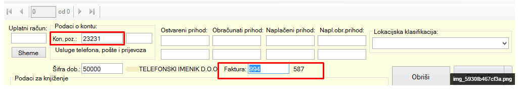Nakon što je upisana šifra dobavljača u kućici Fakture odabire se faktura s kojom se želi povezati obveza koja se knjiži. Automatski se upisuje konto koji je unesen kao trošak obveze na odabranoj ulaznoj fakturi,a pokraj kućice Fakture upisuje se podatak koji je prethodno upisan pod naziv kod knjiženja ulazne fakture.
