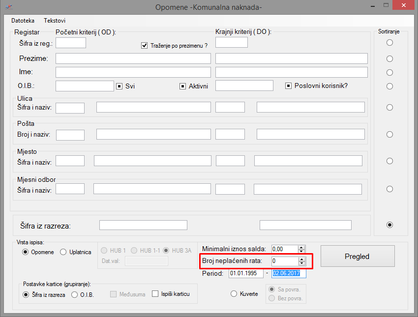 Na ovrhe i opomene dodana je mogućnost postavljanja broja neplaćenih rata. Prilikom zadavanja kriterija za ispis opomena / ovrha upisuje se broj rata. Ovisno koliko rata je upisano, ispisat će se samo obveznici koji imaju taj broj neplaćenih rata ili više. Npr. ako određeni obveznik ima saldo 1000 kn, ali iznos jedne rate mu je 500,00 kn, kada se unese broj rata 6, bez obzira što taj obveznik ima saldo, neće ga uzeti jer ima samo dvije neplaćene rate, ali ako netko ima saldo 1000,00 kn, a iznos rate je 100,00 kn, zadano broj rata 6, tog obveznika će program uzeti u obzir za kreiranje opomena / ovrha jer ima više od 6 neplaćenih rata.
