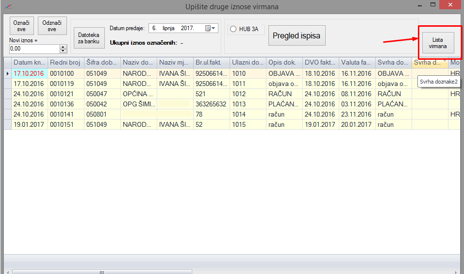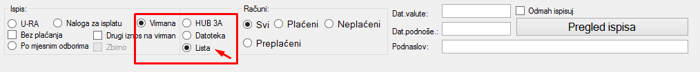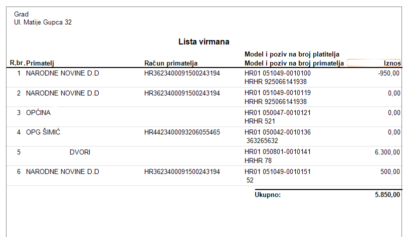 Na pregledu ulaznih računa izrađena je lista virmana. Može se ispisati kao običan izvještaj i izvještaj kod izrade datoteka za banku.
