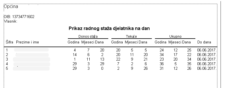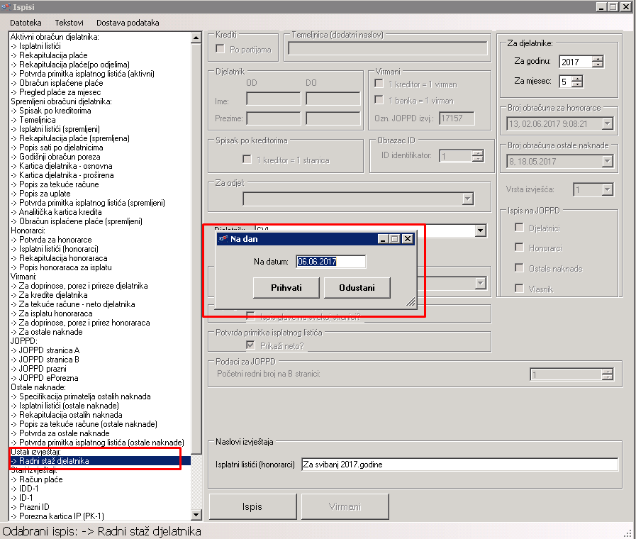 Na ispisima dodan je izvještaj Radni staž djelatnika. Na ostalim izvještajima odabire se Radni staž djelatnika, otvori se prozor u koji se upiše datum s kojim se želi ispisati izvještaj i klikne se na prihvati. Prikaže se izvještaj Radni staž djelatnika na kojem je vidljiv donos staža, tekući staž i ukupan zbroj staža s datumom ispisa.