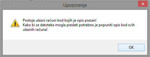 Na sljedećem primjeru nije popunjen opis dokumenta i javlja se sljedeća greška: Postoje ulazni računi kod kojih je opis prazan! Kako bi se datoteka mogla predati potrebno je popuniti opis kod svih ulaznih računa! Znači, potrebno je popuniti sve podatke prilikom unosa ulaznog računa, jer u protivnom, datoteka se neće kreirati.