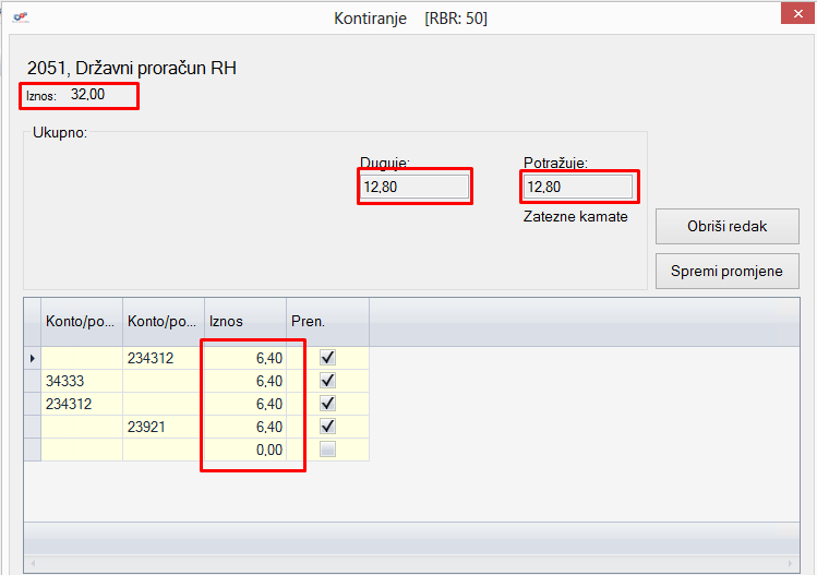 Na izlaznim računima s PDV-om dodana je opcija kojom program omogući spremanje izlaznog računa, a da kontiran iznos nije jednak ukupnom iznosu računa. Na sljedećem primjeru vidljivo je da ukupan iznos računa iznosi 32,00 kn, a kontiran je samo iznos od 6,40 kn. S obzirom da je kontirano na više konta ukupan iznos se zbroji i pod duguje i potražuje iznosi 12,80 kn, a ne ukupan iznos od 32,00 kn. Program dozvoli da se izlazni račun koji je kontiran na ovaj način proknjiži u proračun. Npr. takav način knjiženja može se koristiti kad se treba proknjižiti samo kamata koja se izračuna na osnovicu. U slučaju da je bitan samo iznos kamate knjiži se na ovaj način i osim iznosa te kamate drugi iznos nije bitan i nije ga potrebno nigdje drugdje zaduživati.