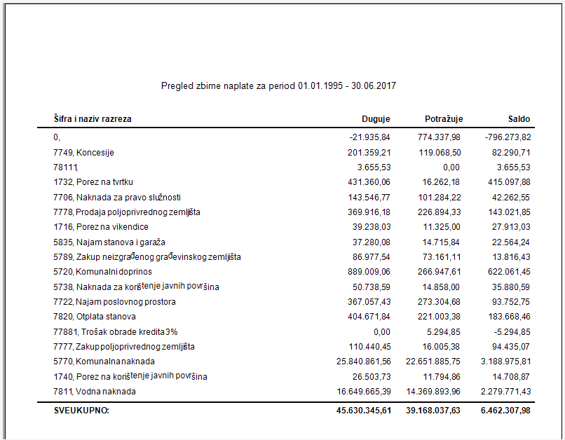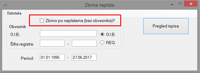 Na zbirnoj naplati dodan je izvještaj: Zbirno po naplati (bez obveznika). To je izvještaj na kojem su vidljive sve naplate koje određeni korisnik ima kao i ukupan iznos duguje i potražuje te saldo za svaku naplatu. Na kraju izvješća vidljiv je ukupan zbroj duguje, potražuje te saldo svih naplata zajedno. Uz pomoć ovog izvještaja u svakom trenu se može vidjeti koliko je zaduženje, uplata, te saldo za svaku naplatu pojedinačno, a da nije vidljiva analitika obveznika.