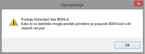 U slučaju da kod neke ulazne fakture nije upisan IBAN pojavit će se obavijest da je potrebno popuniti IBAN kod svih dobavljača.