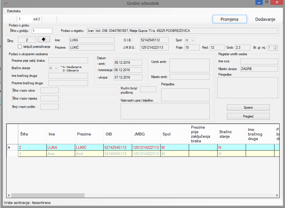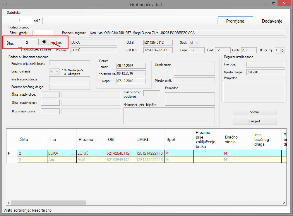 Ako podaci o obvezniku plaćanja grobne naknade ostaju isti, a mijenjaju se samo podaci o ukopanim osobama, klikne se na strelicu koja je označena na sljedećem primjeru, i krene se s novim unosom, a ako se mijenjaju podaci o obvezniku plaćanja grobne naknade u kućici Šifra u grobu izbriše se postojeći i krene se s unosom novog vlasnika. Za niti jednu radnju nije potrebno izlaziti iz grobnog očevidnika.
