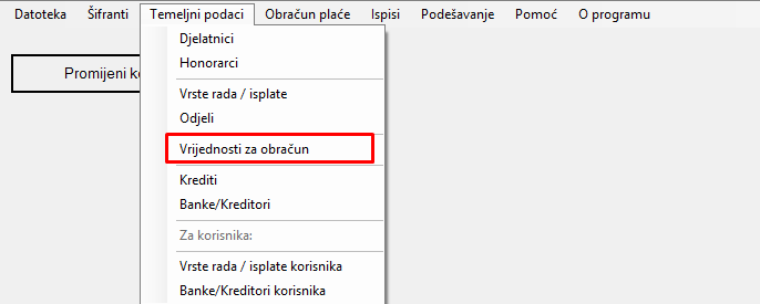 Na temeljnim podacima otvoriti Vrijednosti za obračun.