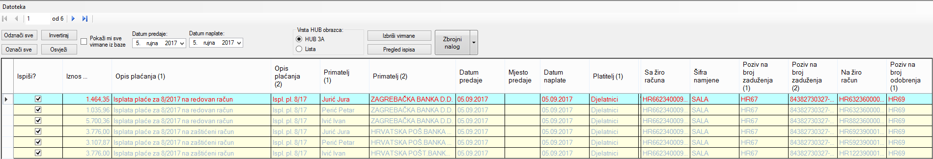 Na sljedećim primjerima prikazani su nalozi za isplatu koji su kreirani na temelju iznosa neto plaće.