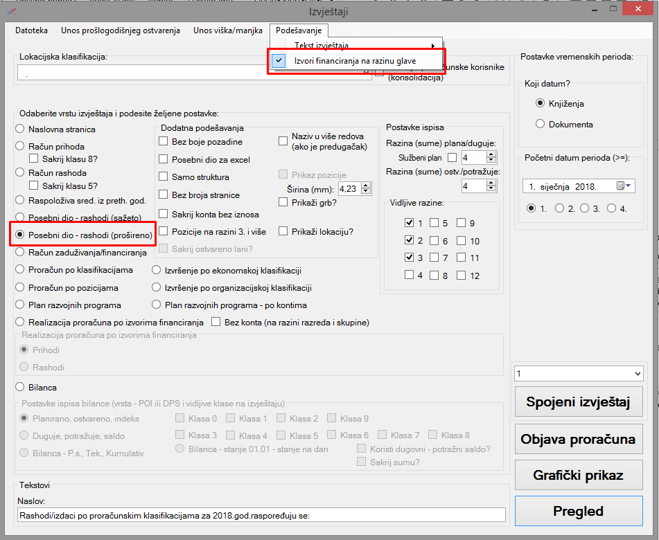 Na izvještaju Poseban dio- rashodi (prošireno) dodana je mogućnost prikaza izvora financiranja. Ovu opciju potrebno je uključiti u izborniku Podešavanje / Izvori financiranja na razini glave.
