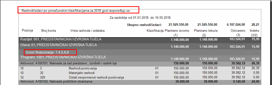 Ako je uključena ova opcija na izvještaju izvori financiranja prikažu se kako je prikazano na slici ispod.