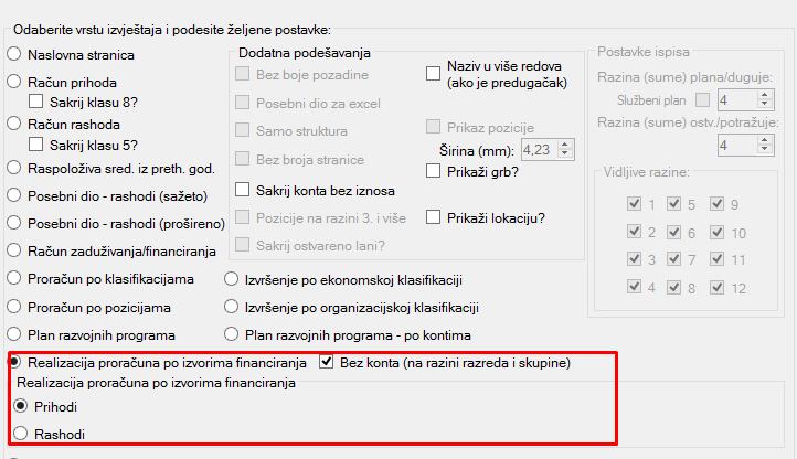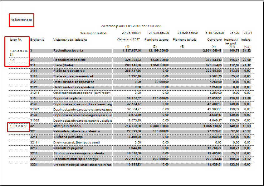 Na izvještaju Račun rashoda omogućen je prikaz izvora financiranja. Izvori financiranja prikazani su na prvoj i drugoj razini.