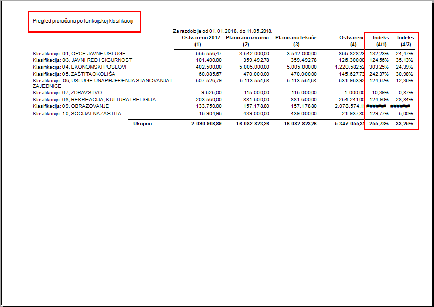 Na izvještaju Proračun po klasifikacijama / Pregled proračuna po funkcijskoj klasifikaciji dodane su kolone koje su nedostajale. Vidljiv je Indeks (4/1) Ostvareno/Ostvareno prethodne godine i Indeks (4/3) Ostvareno/Planirano tekuće.