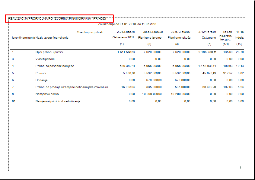 Na izvještaju Realizacija proračuna po izvorima financiranja (Bez konta (na razini razreda i skupine)) vidljivi su izvori financiranja koji su pridodani kontima u proračunu te njihov ukupan zbroj. Kolone koje su vidljive na izvještaju su: Izvor financiranja/naziv izvora financiranja/Ostvareno prethodne godine/Planirano izvorno/Planirano tekuće/Ostvareno/Indeks pret./tek. god./Indeks ostvareno/planirano.