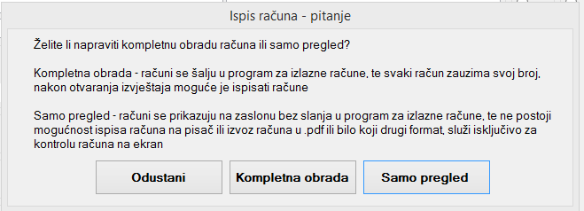 Klikom na Prihvati otvori se prozor u kojem se odabire Odustani, Kompletna obrada ili Samo pregled.