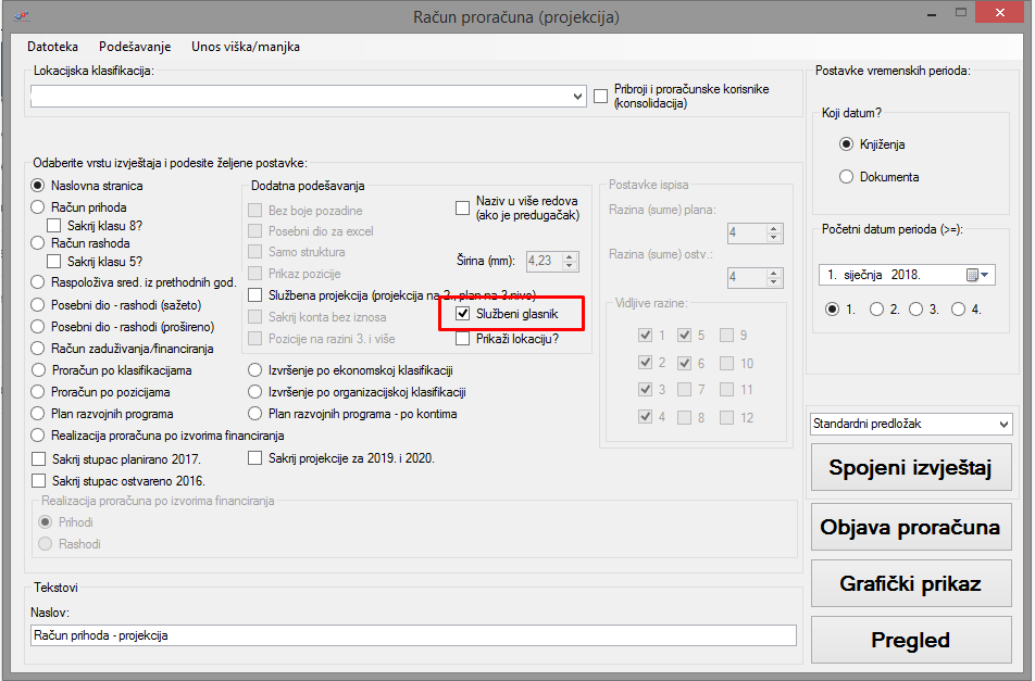 Na izvještajima vezanim uz projekciju proračuna dodana je opcija Službeni glasnik. Ova opcija služi za prebacivanje izvještaja koji se objavljuju u .rtf format. Potrebno je odabrati željeni izvještaj, odabrati opciju Službeni glasnik i kliknuti Pregled ili koristiti opciju Spojeni izvještaji u kojem su objedinjeni svi izvještaji koji su potrebni za objavu.