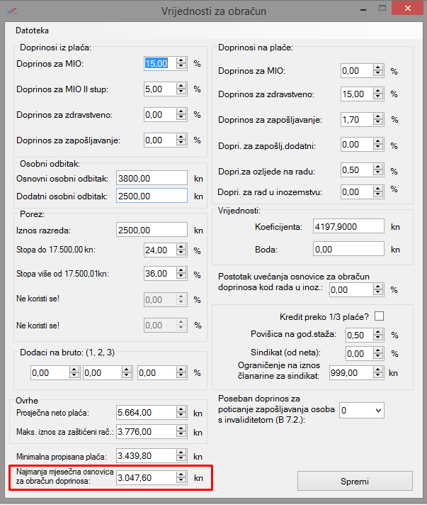 Izmjenama Zakona o minimalnoj plaći, uvedeno je 50%tno smanjenje osnovice za obračun doprinosa na minimalnu plaću. Smanjenje se odnosi samo na doprinose za zdrastveno osiguranje, zapošljavanje i zaštitu na radu. Da bi se doprinosi na plaću obračunali na spomenuti način u programu je potrebno podesiti sljedeće: u Temeljnim podacima / Vrijednost za obračun upisati Najmanju mjesečnu osnovicu za obračun doprinosa koja iznosi 3.047,60 kn. .
