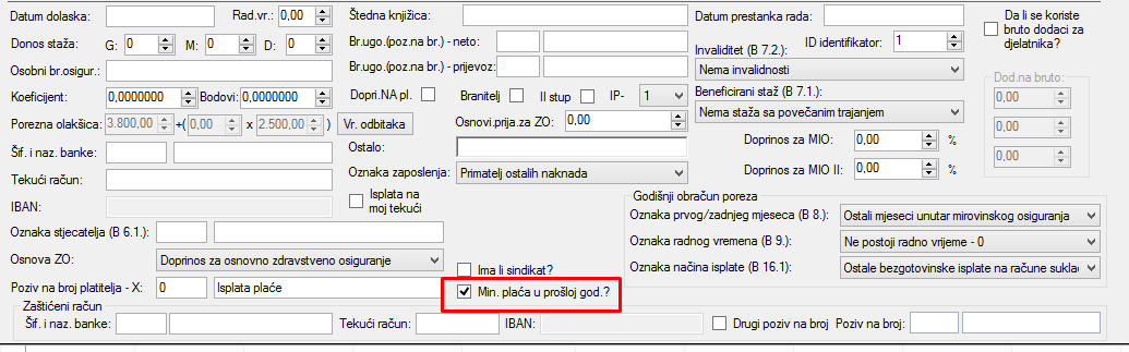 Djelatnicima koji imaju pravo na umanjenu isplatu doprinosa na plaću potrebno je u Temeljni podaci / Djelatnici označiti da ima pravo na Min. plaću u prošloj godini. Djelatnicima kojima je stavljena kvačica i kojima osnovica za obračun doprinosa nije veća od propisane Minimalne osnovice za obračun doprinosa program bude izračunao doprinose na plaću umanjene za 50%.