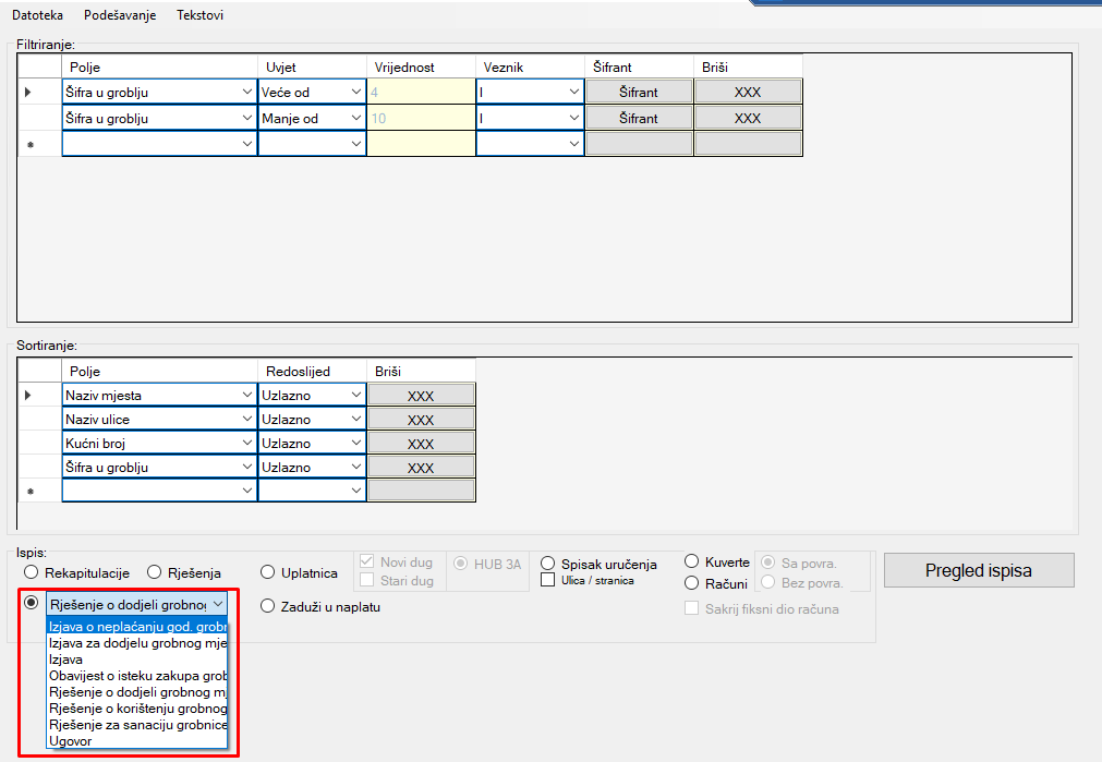 U programu Groblje omogućen je ispis raznih izjava ili Rješenja. npr. Izjava o neplaćanju godišnje grobne naknade ili Rješenje o korištenju grobnog mjesta. Iz pripadajućeg izbornika odabere se željena izjava ili rješenje, klikne se Pregled ispisa i željena izjava ili rješenje se ispiše.