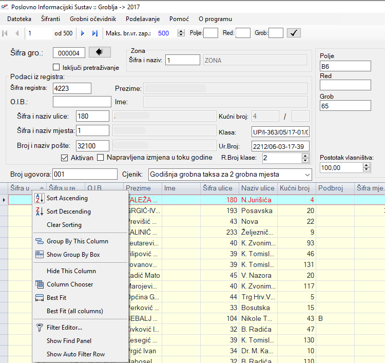 U program groblje stavljena je nova tabela za prikaz podataka. Način korištenja nove tabele za prikaz podataka opisan je u članku Upute za zadavanje kriterija za sortiranje.