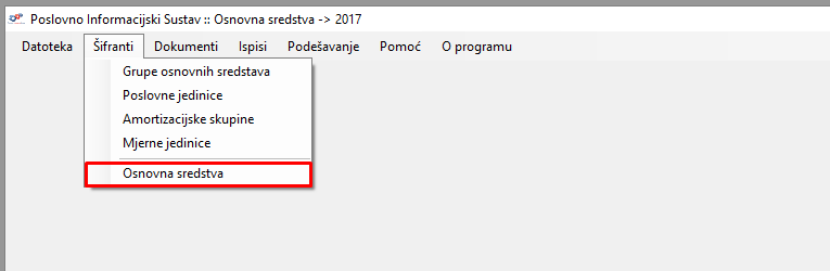 Da bi se osnovna sredstva koja su unesena u UraIra povukla u program Osnovna sredstva potrebno je kliknuti Šifranti/Osnovna sredstva.