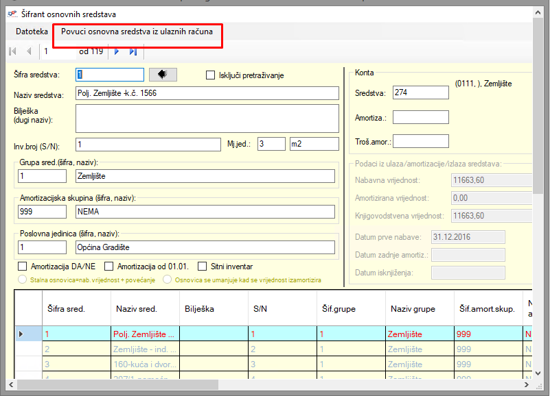 U Šifrant Osnovnih sredstva dodana je opcija Povuci osnovna sredstva iz ulaznih računa.