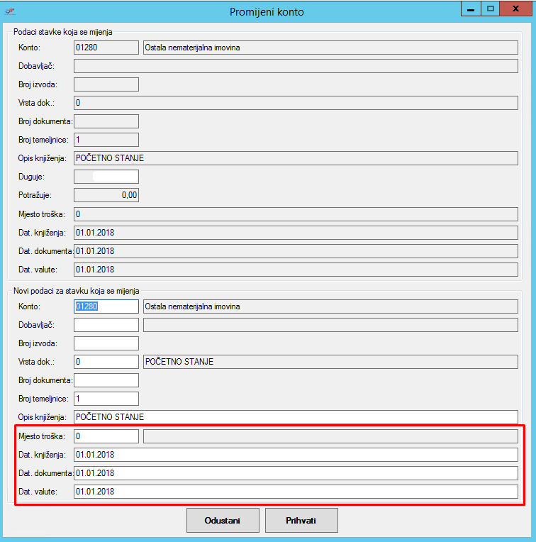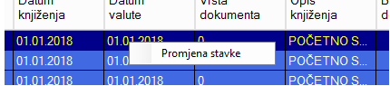 Također je dodana mogućnost promjene mjesta troška, datuma knjiženja, datuma dokumenta i datuma valute. Do ovih opcija moguće je doći desnim klikom na stavku kojoj želimo promijeniti podatke te odabirom opcije Promjena stavke kod čega se otvara prozor kao na slici ispod.