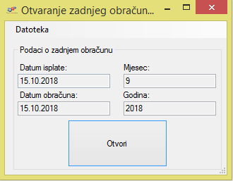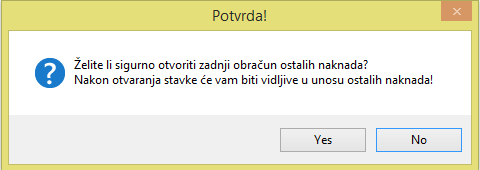Klikom na Yes otvara se prozor sa podacima o zadnjem obračunu koji je napravljen(podaci su informativnog karaktera te se ne mogu mijenjati niti brisati). Klikom na Otvori otvaramo obračun ali nas program još jednom pita za potvrdu. Klikom na Yes program javlja da je obračun uspješno otvoren.