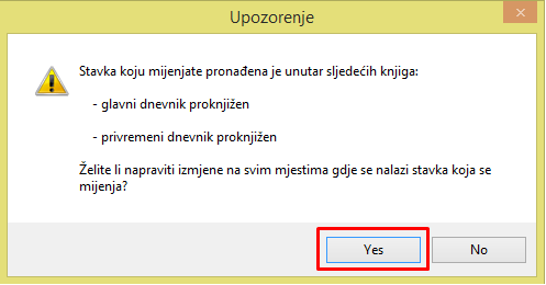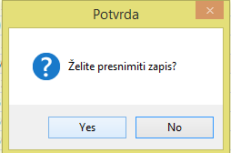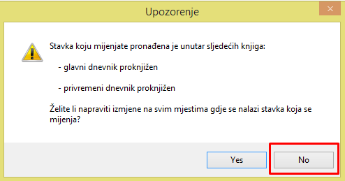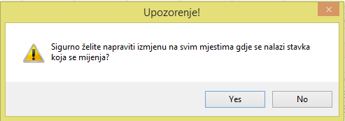Klikom na Yes, pojavljuje se Upozorenje, dok se klikom na No ne sprema ništa.