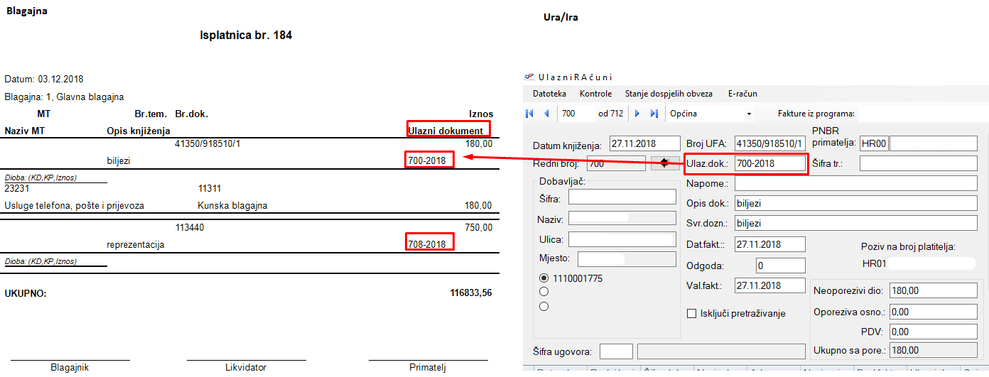 Na ispisu isplatnica je dodan stupac za ispis ulaznog dokumenta, odnosno vrijednost koja je upisana u Ura/Ira -> Ulazni računi za tu fakturu . npr. 700-2018 ili 708-2018. Cilj ove opcije je omogućiti brže i lakše povezivanje uplatnica koje su plaćene gotovinom iz blagajne.