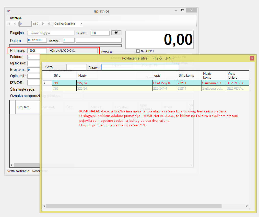 Ulazni dokument se na isplatnicu dodaje tako da se kod njezinog kreiranja, nakon što primatelj bude odabran, klikom u polje Faktura pojavljuje skočni prozor sa popisom svih ulaznih faktura koje su vezane za njegovu šifru, a još uvijek nisu plaćene(slika ispod). U tom prozoru potrebno je odabrati fakturu za koju se kreira isplatnica kako bi se plaćanje moglo automatski evidentirati i u Ura/Ira. Taj odabrani broj fakture će se prikazati u polju Br. dokumenta te će se prilikom knjiženja isplatnice prikazati na izvještaju (slika iznad).