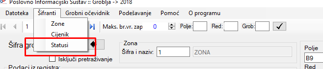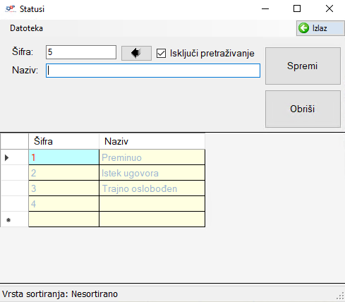 Novi unos vrši se klikom na strelicu pokraj polja Šifra te se automatski generira sljedeća prazna šifra, dok se polje Naziv popunjava proizvoljno.