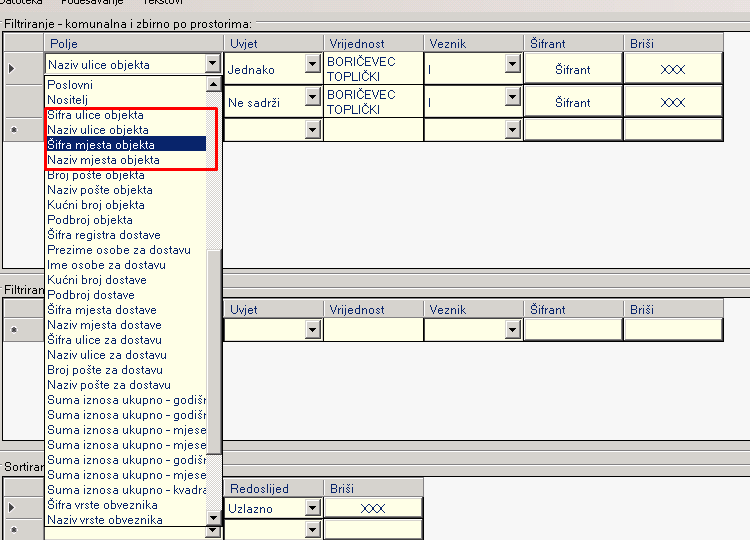 - U prozoru za Pregled i zaduživanje dodana je mogućnost filtriranja prema Nazivu ulice i/ili mjesta objekta te Šifri ulice i/ili mjesta objekta. Unosom ovih kriterija program ispisuje one obveznike koji ih zadovoljavaju. U ovom slučaju stavili smo za kriterij da se ispišu oni obveznici koji imaju dodan Naziv ulice objekta = Boričevec Toplički i da Naziv ulice ne sadrži Boričevec Toplički.