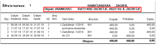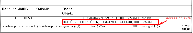Klikom na Pregled ispisa, ispisuju se svi oni obveznici koji zadovoljavaju gore unesene kriterije. Na ispisu dokumenta nalazi se adresa osobe upisana u Registar zajedno sa adresom objekta.