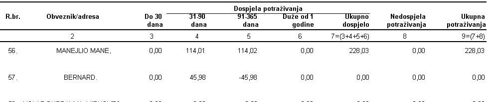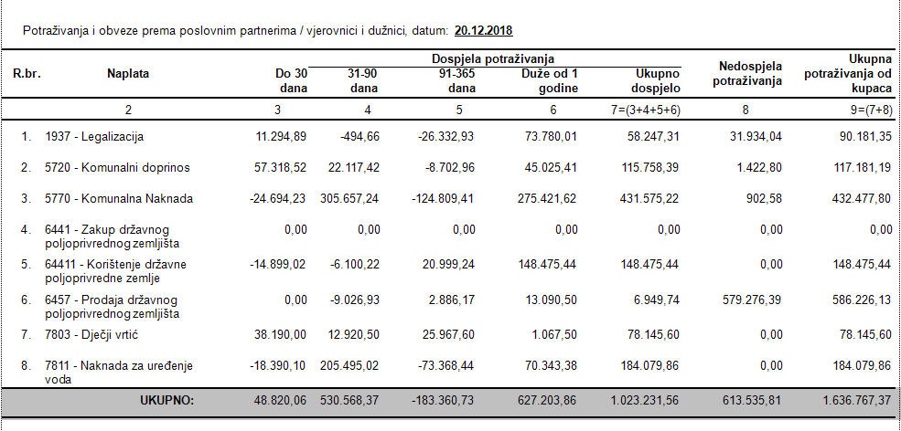 - Na zbirnoj naplati dodan je novi izvještaj Potraživanja i obveze prema poslovnim partnerima/vjerovnicima i dužnicima. Na izvještaju se prikazuju iznosi dospjelih i nedospjelih potraživanja razvrstani po naplatama. Prilikom otvaranja izvještaja program pita do kojeg datuma je potrebno izračunati dug.