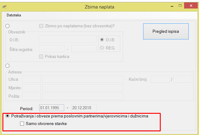 Zadana je postavka da se ispisuju potraživanja i obveze prema saldu svih stavaka, a ukoliko je potrebno ispisati izvještaj u kojem su sadržane samo otvorene stavke tada se stavi kvačica pored opcije Samo otvorene stavke