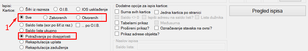 Također, važno je odabrati želimo li ispisati izvještaj za sve stavke(otvorene i zatvorene) ili samo za otvorene stavke. To se određuje odabirom opcije Sve ili Otvorene u polju koje je označeno brojem 1. U programu je podešeno da, ukoliko se ne izabere drugačije, program gleda saldo svih stavaka (i otvorenih i zatvorenih).