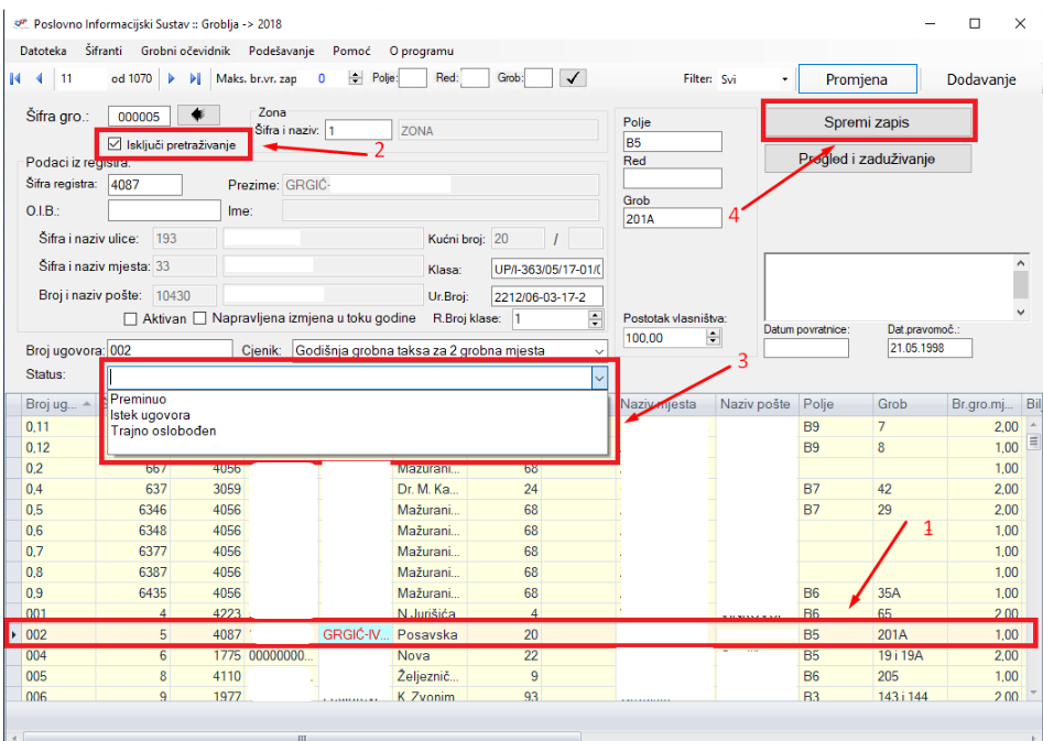 Kako bi se taj status mogao pridružiti određenom obvezniku, na početnoj stranici dodan je padajući izbornik u kojem je moguće odabrati jedan od prethodno upisanih statusa. Oni se mogu dodati na način da se lijevim klikom miša odabere obveznik kod kojeg je potrebno unijeti status, opcija Isključi pretraživanje označi se kvačicom te se dodijeli jedan od statusa. Klikom na Spremi program sprema promjenu.