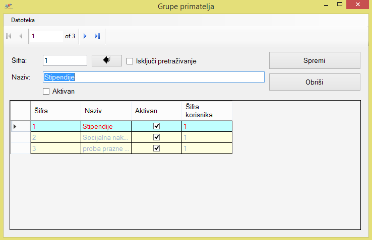 Grupe primatelja: u ovom izborniku moguće je kreirati određene grupe u koje ćemo naknadno dodati primatelje(npr. stipendije, socijalna naknada, ...) . Važno je naglasiti da se ovdje kreiraju one grupe kod kojih se isplate vrše svaki mjesec pa je cilj da se olakša postupak unosa korisnika, odnosno da se oni unesu jednom te se kod sljedeće isplate ti isti korisnici samo povuku iz grupe koja je prethodno kreirana.