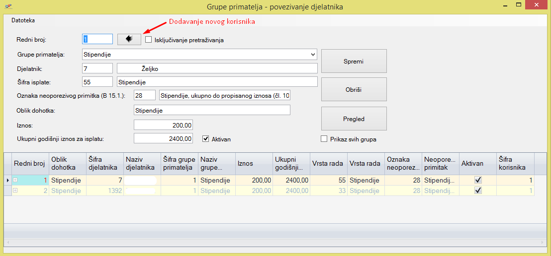 Grupe primatelja - povezivanje s djelatnicima: u ovom izborniku vrši se unos korisnika u određene grupe (npr. u grupu stipendije koja je prethodno kreirana).