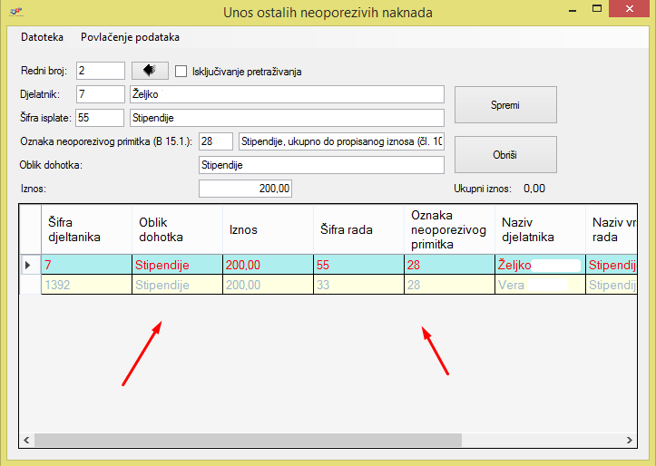 - odabir vrste neoporezivog primitka koji su definirani u Šifranti