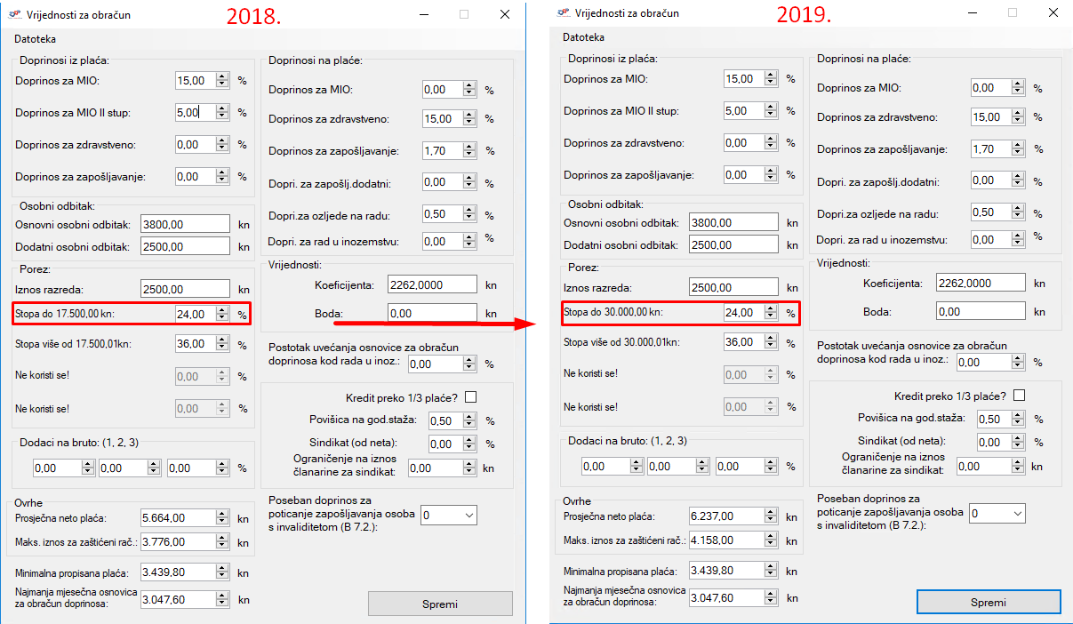 Porezni razred povećao se sa 17.500,00 na 30.000,00 kn. Prema tome, stopa poreza na dohodak od 24% obračunavati će se na poreznu osnovicu do 30.000,00 k, a iznad navedene svote obračunavati će se porez po stopi od 36%.