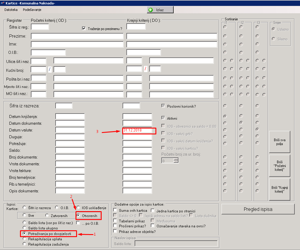 Iznad navedene podatke koji su potrebi za provođenje ispravka vrijednosti potraživanja možete dobiti u našem programu Naplata-> Kartice-> Potraživanja po dospjelosti(1). Na ovom izvještaju prikazuje se saldo potraživanja otvorenih stavaka(2) prema datumu valute, kojeg je potrebno obavezno podesiti na datum koji je potreban(3), prikazan po obveznicima u odabranom razrezu. (Slika ispod)