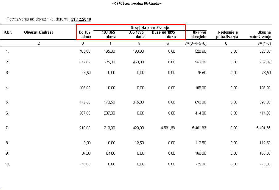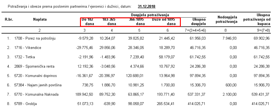 Klikom na Pregled ispisa prikazuje se izvještaj sa slike ispod u kojem su iznosi razvrstani prema vremenskim razdobljima i obveznicima. Ova vremenska razdoblja nisu fiksna nego ih je moguće podesiti prema tome što je potrebno ispisati.