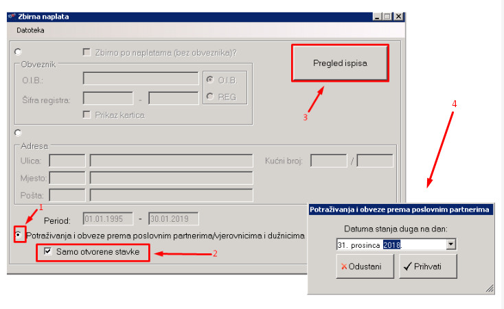 Također, ovakav izvještaj moguće je ispisati i u izbornik Datoteka-> Zbirna naplata-> Potraživanja i obveze prema poslovnim partnerima/vjerovnicima i dužnicima gdje se taj izvještaj označi(1), stavi se kvačica u Samo otvorene stavke(2), klikne se na Pregled ispisa(3) te podesi krajnji datum valute(4).