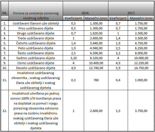 Od 01. siječnja 2017. godine, iznos uvećanja osnovnog osobnog odbitka utvrđuje se množenjem osnovice osobnog odbitke (utvrđene u iznosu od 2.500,00 kn) s pripadajućim koeficijentima.