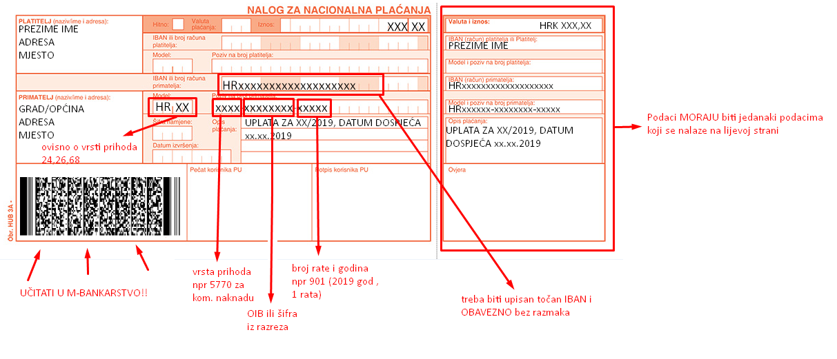 Također Vas molimo da prije nego što počnete ispisivati sve uplatnice OBAVEZNO ispišete 1 primjerak kako bi bili sigurni da se podaci nalaze svaki u za to određenoj kućici kao što je prikazano i na slici iznad.