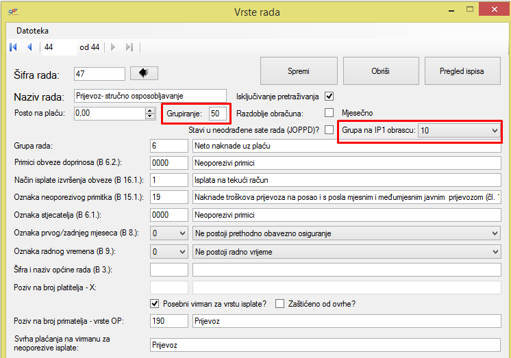 - Kreirati novu vrstu rada u izborniku Temeljni podaci -> Vrste rada/isplate te popuniti sa podacima kao na slici ispod: