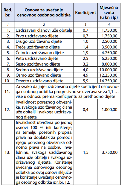 U tablici ispod prikazane su osnove za uvećanje osobnog odbitka sa pripadajućim koeficijentima, odnosno mjesečnim svotama uvećanja osobnog odbitka: