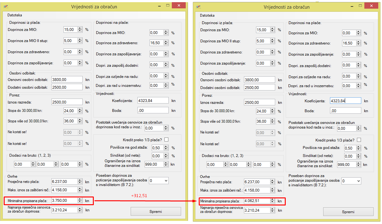 Ovu vrijednost možete promijeniti u izborniku Temeljni podaci -> Vrijednosti za obračun na način da promijenite vrijednost minimalne propisane plaće(primjer je prikazan na slici ispod).